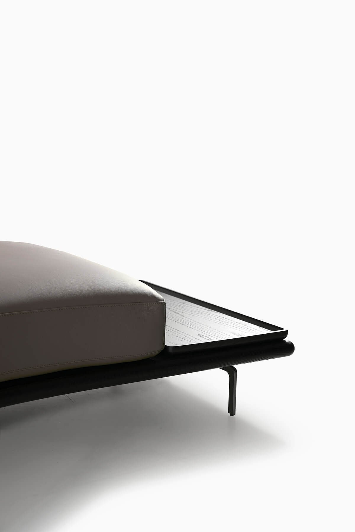 The base of the sofa is characterized by a thin, lightweight platform supported by minimal metal legs that enhance the sense of suspension and visual lightness Integrated into this platform are thin panel that act as supports for the backrests.